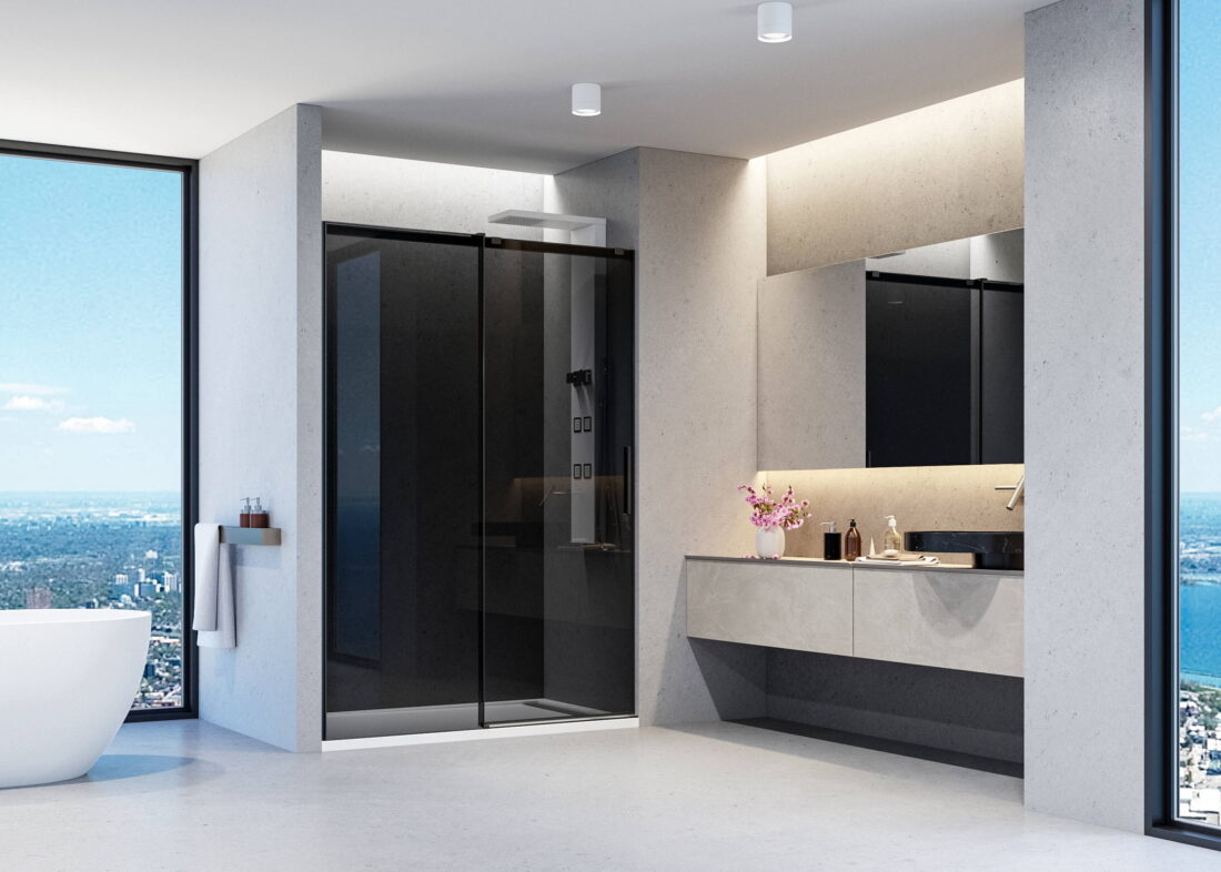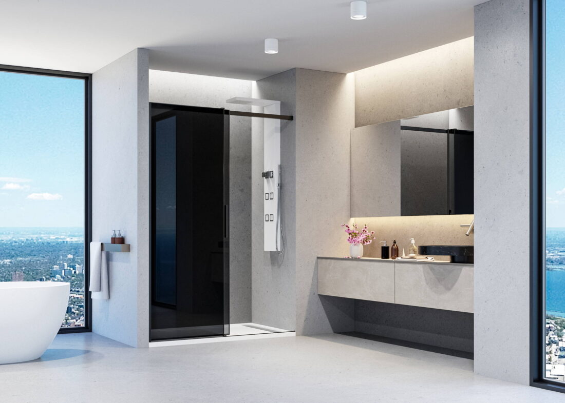 Pevný panel WELLNESS BLACK F1 je dodávaný iba v kombinácii s posuvnými dverami WELLNESS BLACK B2.